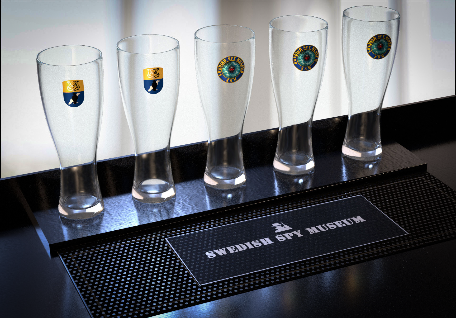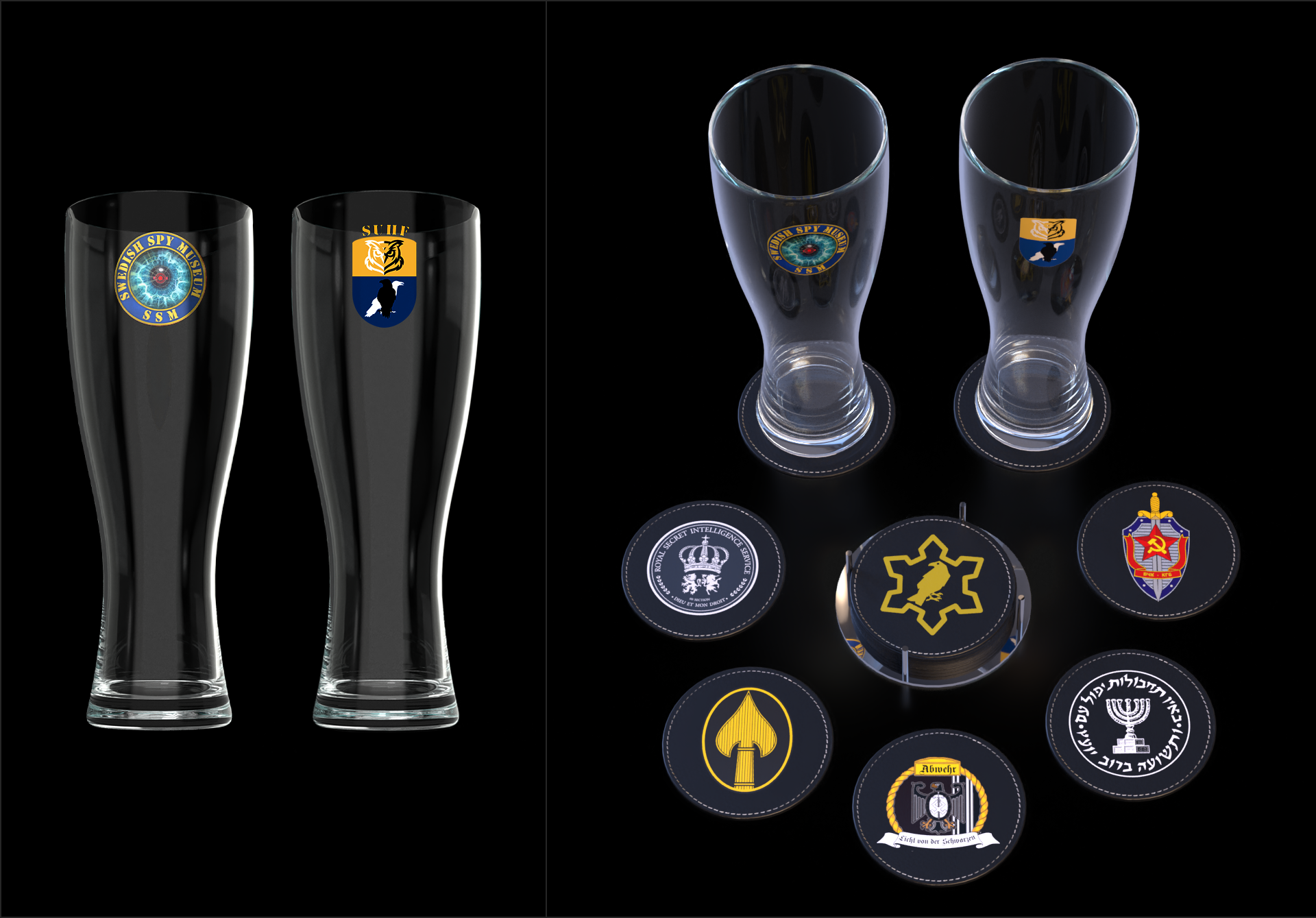 3D glass & coaster-sets created to showcase Swedish Spy Museum's profile product idea for dedicated web shop.